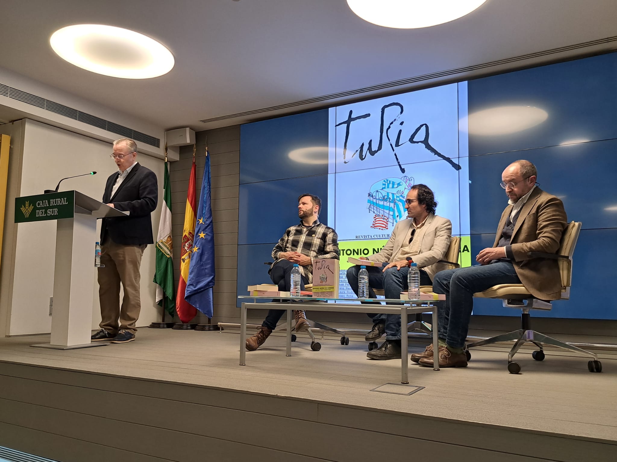 El centro cultural García Palacios-Caja Rural del Sur ha acogido este miércoles, 18 de marzo, la presentación de un número doble especial de la revista ‘Turia’ que incluye un monográfico dedicado a Antonio Núñez de Herrera (Campanario, Badajoz, 1900-Monte Gordo, Portugal, 1935), uno de los prosistas imprescindibles del grupo Mediodía. Autor de la obra imprescindible ‘Sevilla: Teoría y realidad de la Semana Santa’ (1934), este periodista y escritor estuvo cuatro décadas olvidado hasta que comenzó a reivindicarse a partir de 1981. En este especial de Turia se incluyen, entre otros, textos de José María Rondón, Eva Díaz Pérez, Carlos Mármol y Juan Bonilla, una entrevista al artista Pedro G. Romero y una completa biocronología a cargo de sus coordinadores. En el acto de este miércoles, además de Rondón, han participado en una charla César Rina y Fernando del Val, con la presencia de Carmen Corral de la Fundación Caja Rural del Sur.